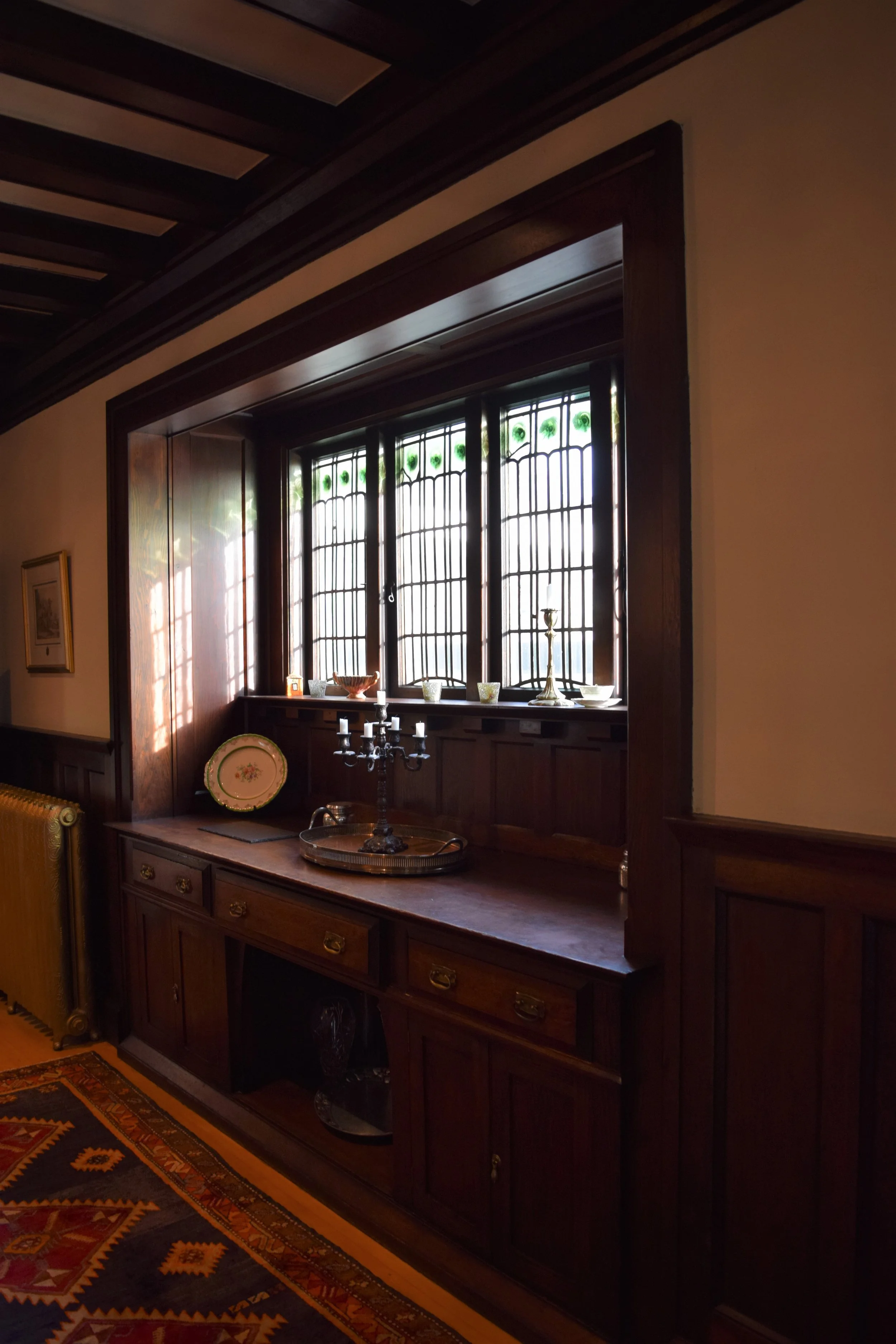 Handsome built-in cupboards and a row of leaded-glass quarry windows in the dining room. Photo courtesy of Jennifer Clay.