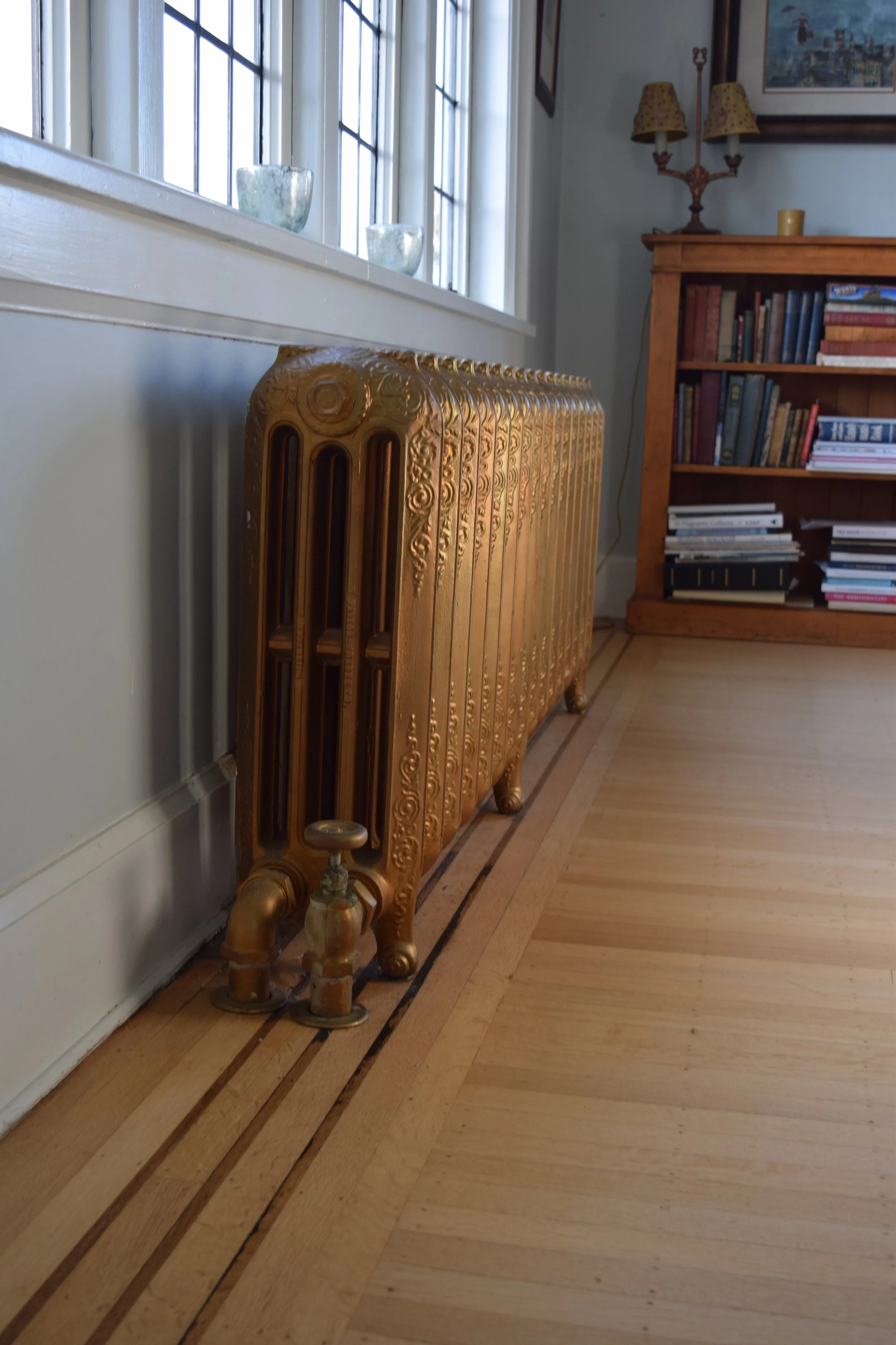 Cast iron (painted gold) hot water radiators which are more efficient and more effective than forced air or electric heat. Photo courtesy of Jennifer Clay.