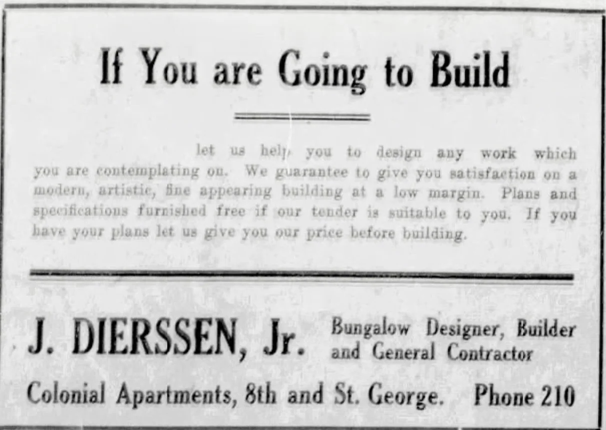 The Dierrsens as a family were very active in the Lonsdale area. Not only did John Sr. have grocery stores and help Anna run the Colonial, but he was also a real estate agent, selling homes that were likely built by his son John Jr, as well as advertising for rental homes and even garden plots. John Jr. had his own company and appears to have built a lot of homes in the area.