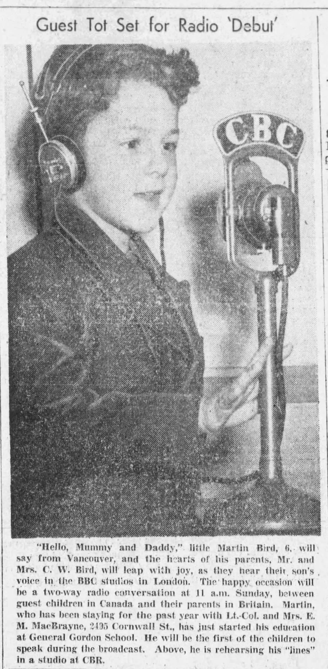 One of the evacuees, known here as ‘guest children’, was Peter West, aged 13. As the newspaper clip below shows, Peter - who attended one of the North Shore boarding schools - was one of the lucky few chosen to speak to his parents via a CBC overseas two-way radio hook-up.