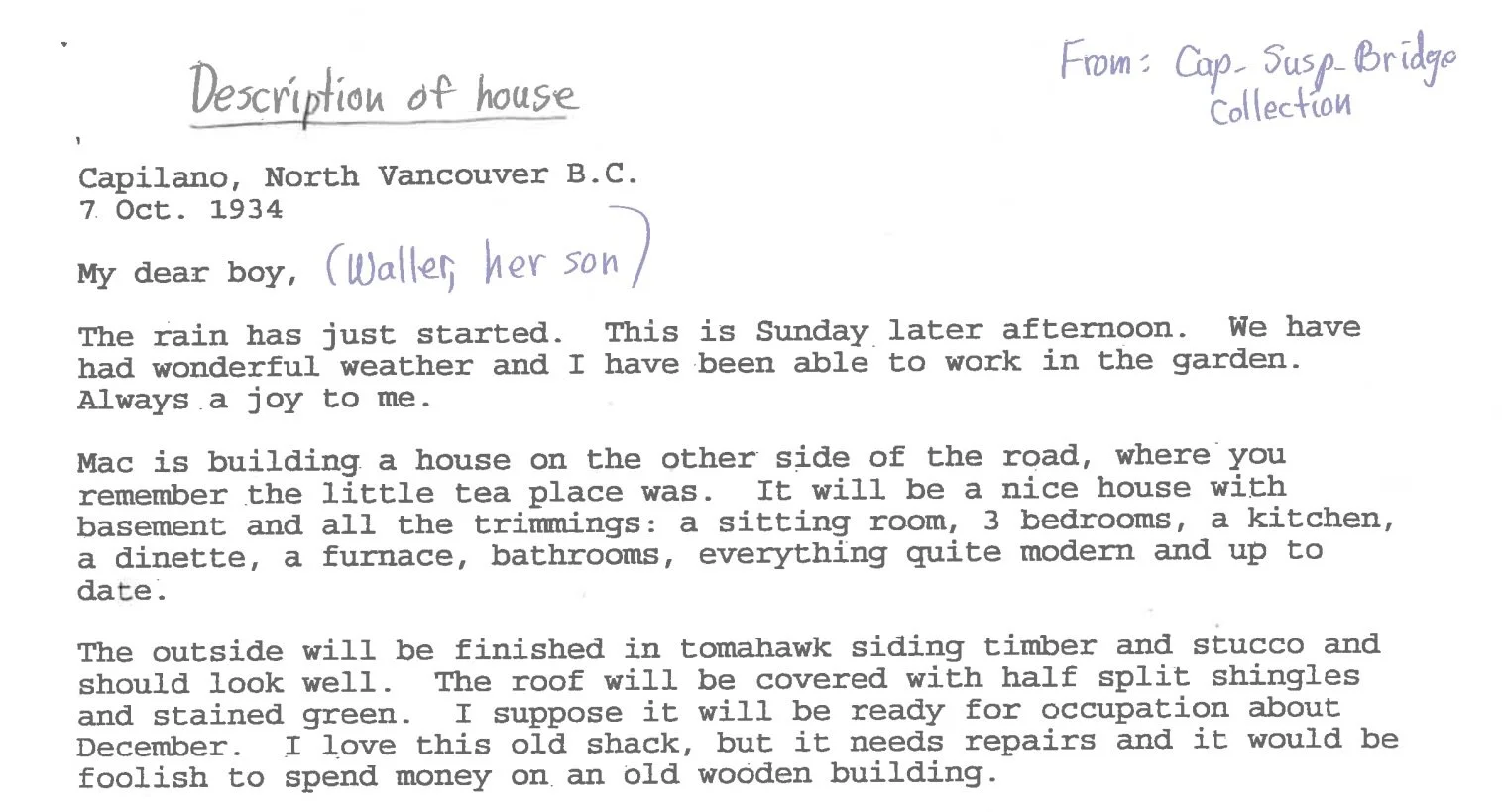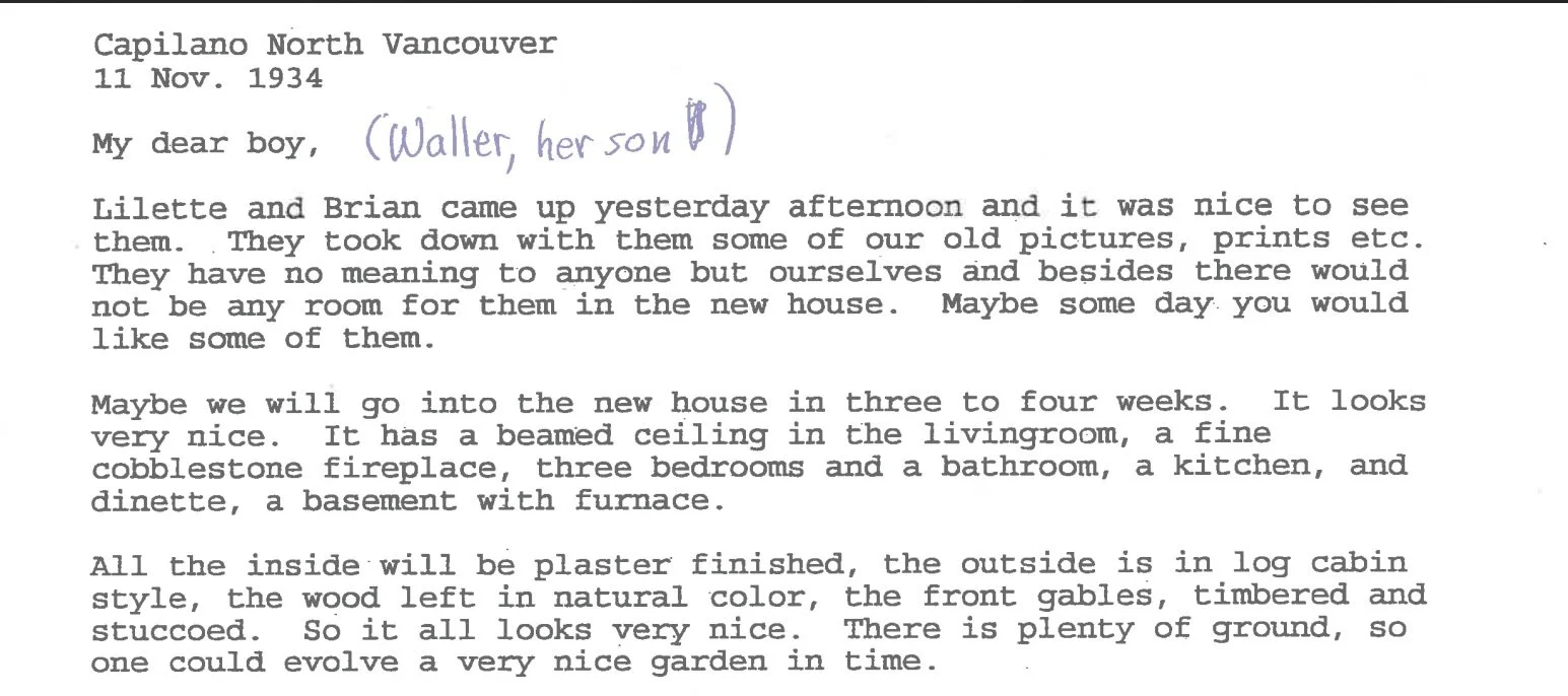 She didn’t end up moving in with her dad and step-mother in North Vancouver, she moved to Vancouver, instead. Shortly after, Mac found a place to live in Vancouver and he went to his and Lili’s home in Capilano, abruptly took his things and announced he was leaving the canyon and going to live in Vancouver with his daughter for a while. Lili, on the one hand understood that Mac was making up for lost time with Irene, since he had missed out on raising her, but on the other hand, she didn’t know when he would come back. She was very attached to Mac and it was hard on her. There are a number of letters written to her son, Waller, in the Capilano Suspension bridge archival collection, and she wrote in one of them that before leaving, Mac said “ Betty, I will come and see you. We will be together again.” She then wrote “ It’s been a month since he’s been gone”. It must have been exceedingly difficult to be supportive while also hoping her husband would make good on his word and come back to her. He had already left once before for a prolonged period when they were struggling financially to buy rum in the West Indies to sell across the border during prohibition! But this was somehow different!