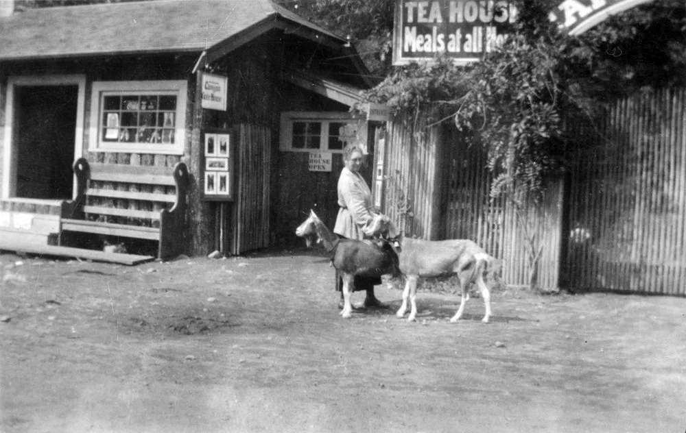 Inventory #151-90. Lili with her goats at the Suspension bridge tea house.