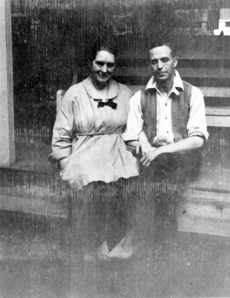Inventory #151-90 Elizabeth and Mac McEachran on porch of gatehouse ca. 1920.